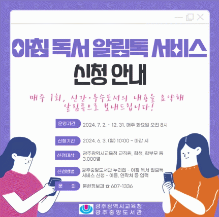 이번 사업은 시교육청의 ‘다시 책으로’ 프로젝트와 연계해 교직원과 학생이 틈틈이 책을 읽는 독서 환경을 제공하기 위해 올해 처음 시행되는 모바일 서비스로 신청자들에게는 매주 화요일 오전 8시에 신간 및 베스트셀러 도서 6권에 대한 도서 요약 정보와 글로벌 트렌드 1건을 알림톡 또는 문자로 발송해 준다.