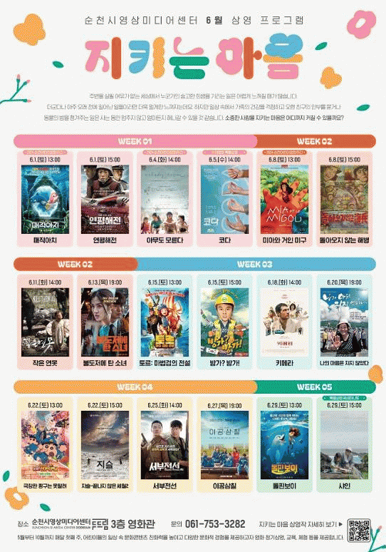 영화는 사전 신청 없이 자유롭게 관람할 수 있으며, 자세한 사항은 순천시영상미디어센터 홈페이지 또는 전화로 문의하면 된다.