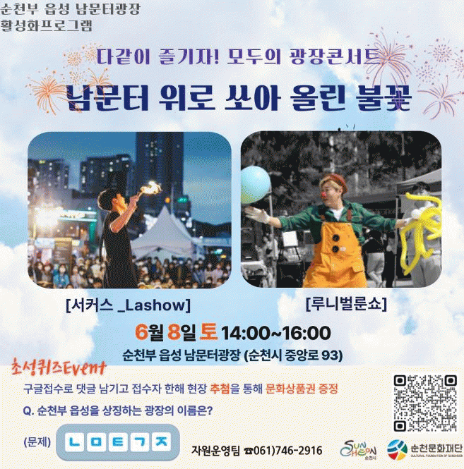 6월 8일에는 ‘남문터 위로 쏘아올린 불꽃’이라는 주제로 ▲나일준(서커스 Lashow) ▲이경창 루니벌륜쇼(저글링, 마술, 벌룬쇼) 등 다같이 즐길 수 있는 체험형 공연이 진행된다.