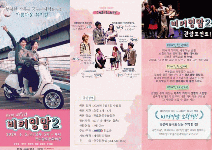 진도군 인구정책실 관계자는 “행복한 가족을 꿈꾸는 군민들을 위해 임신과 출산을 소재로 한 가족 공감 뮤지컬을 준비했다”며 “공연을 통해 생명의 소중함과 출산‧육아가 안겨주는 행복을 널리 알려 저출산에 대응하며 출산 친화적인 환경 조성을 위해 최선을 다하겠다”고 말했다.