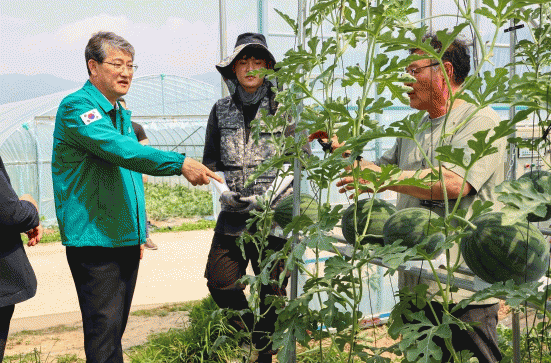 김순호 군수는 지난 3일 영농 2년 차인 청년 농업인 농장을 둘러보고, 수박이 고소득 미래작물로 더욱 성장할 수 있도록 수직 재배 단지를 적극적으로 확대해 나가겠다고 밝혔다.