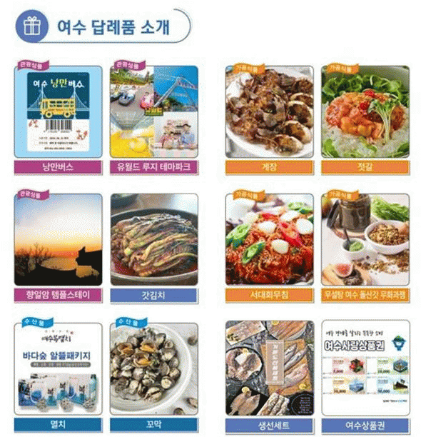 현재 여수시 고향사랑기부제 답례품 공급업체는 총 40개로, 대표 답례품은 돌산갓김치, 멸치, 생선세트, 젓갈 등이 꼽힌다.