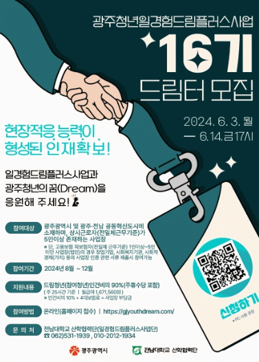 사업에 선정된 16기 ‘드림터’는 8월부터 12월까지 5개월간 광주시로부터 참여청년 인건비 90%를 지원받고, 청년에게 일경험을 제공한다. 이를 통해 지역 내 미취업 청년의 역량 강화를 돕고, 현장 적응 능력을 갖춘 인재영입의 기회를 갖게 된다.