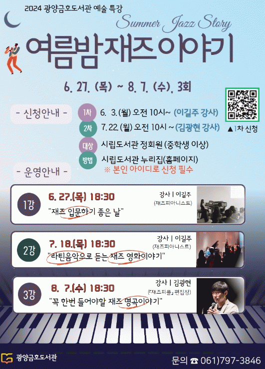 금호도서관이 기획한 예술 특화 시리즈 강연인 ‘여름밤 재즈 이야기’는 재즈피아니스트이자 재즈 전문 음악 커뮤니티인 ‘재즈인랩’의 이길주 대표와 재즈 음악 전문 잡지 ‘재즈피플’의 김광현 편집장을 각각 초청해 다양한 관점에서 재즈 음악에 대해 감상해 보는 시간을 가질 예정이다.