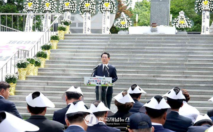 김영록 지사는 추념사에서 “선열들의 숭고한 희생을 바탕으로 자랑스러운 역사를 이어올 수 있었다”며 “앞으로도 ‘의향 전남’의 정신을 계승 발전시키고 나라 사랑 정신이 후대에 이어지도록 국가유공자의 선양과 보훈에 더욱 힘쓰겠다”고 말했다.