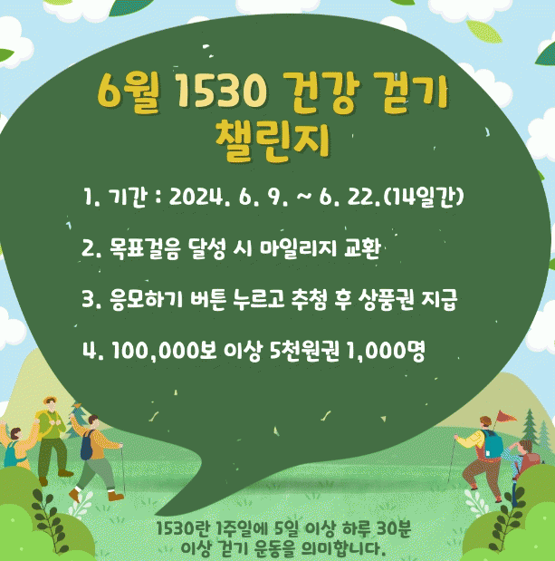 챌린지 기간 중 10만보를 걸으면 10만 마일리지가 쌓이고 목표 걸음수 10만보 달성 시 모바일문화상품권 5천원권(1,000명) 응모가 가능하다.