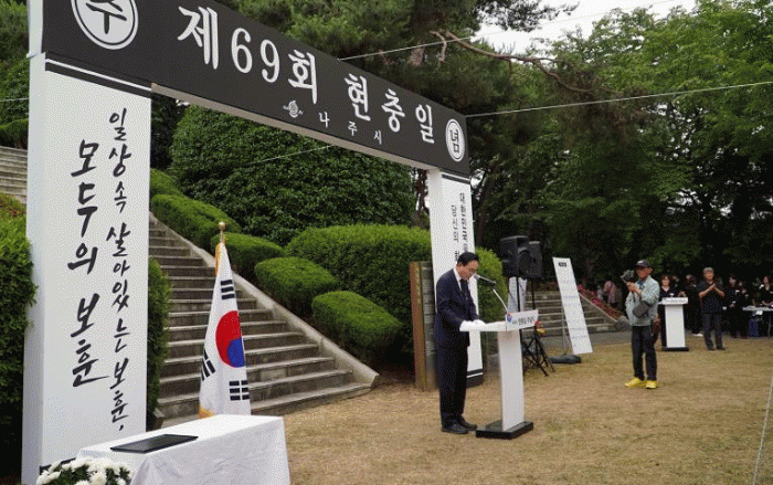 윤병태 나주시장은 추념사에서 “선열들의 거룩한 얼을 기리고 국가유공자와 보훈가족이 존경받으며 명예로운 삶을 사는 사회를 만드는 것이 우리의 몫”이라며 “국가 유공자와 보훈가족들이 자긍심을 갖고 살아갈 수 있도록 각별한 예우와 보훈 선양사업에 더욱 힘써가겠다”고 강조했다.