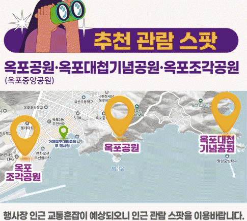 거제시 관계자는 “인근 지역 시민들에게 비행소음 양해를 부탁드리며, 옥포수변공원이 아니더라도 추천 관람 스팟(△옥포(중앙)공원 △옥포대첩기념공원 △옥포조각공원)에서 상공에서 펼쳐지는 에어쇼를 마음껏 감상할 수 있으니 많은 이용 바란다.”고 전했다.