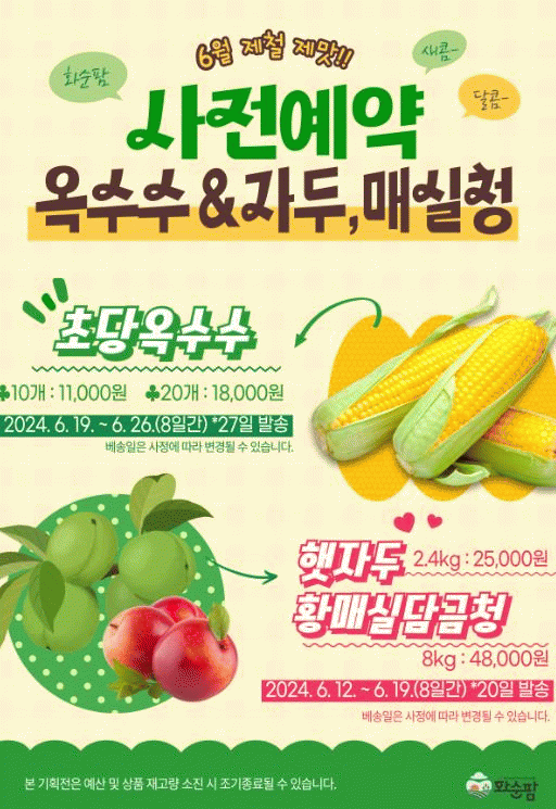 또한, 자두와 매실청은 6월 12일부터 19일까지 초당옥수수는 6월 19일부터 26일까지 사전 예약 판매를 진행한다.