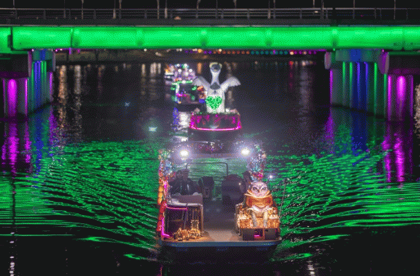 수상 퍼레이드는 총 8척의 선박에 순천만습지와 국가정원을 상징하는 짱뚱어, 칠게, 흑두루미 등의 캐릭터 조형물로 연출하고 야간에 형형색색 조명을 더해 무리 지어 이동하는 모습은 동천변 야간경관과 어우러져 색다른 볼거리를 제공한다.