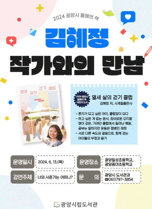 김혜정 작가는 ‘너의 사춘기는 어떠니?’를 주제로 ▲'열세 살의 걷기 클럽'을 통해 보는 사춘기의 의미 ▲현명하게 사춘기 보내는 방법 등에 대해 들려주고 학생들과 건강한 성장에 관한 이야기를 나눌 예정이다.