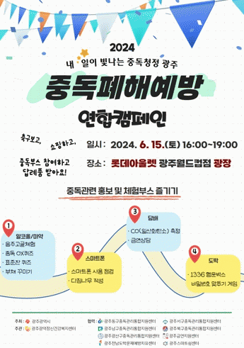 ‘내일이 빛나는 중독 청정 광주’를 주제로 ▲4대 중독(알코올, 도박, 인터넷, 마약) OX 맞추기 ▲음주고글 체험 ▲흡연자 대상 일산화탄소(CO) 측정과 금연상담 ▲행운박스 비밀번호 맞추기(1336) ▲중독예방 부채 꾸미기 등 다양한 체험부스를 운영한다.
