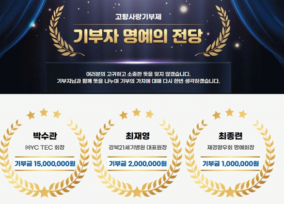 한편 지난 1월 지역사업자 장재용 대표와 5월 최재영 강북21세기병원 대표원장이 각 200만 원을, 2월에는 최종련 여수시 재경향우회 명예회장도 100만 원을 기부하며 고향사랑 기부제에 힘을 실었다.