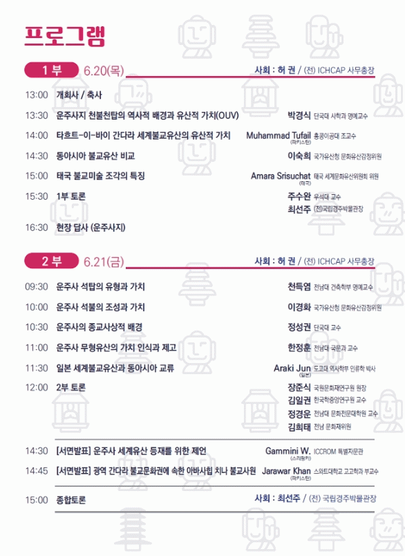 이번 학술대회는 운주사 석불·석탑군의 탁월한 보편적 가치(OUV)에 대한 연구 논의와 더불어, 불교 유산에 대한 국제 사회의 다양한 사례를 접하기 위해 스리랑카, 파키스탄, 태국, 일본 등 국내외 전문가 19명이 2일 동안 발제와 토론을 통하여 활발한 논의가 진행될 전망이다.