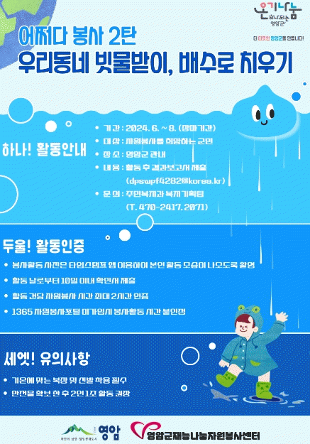 이번 캠페인은 자원봉사를 희망하는 영암군민이 참여해 빗물받이, 배수로 등을 치우면, 영암군이 활동을 인증해 주는 방식으로 진행된다.