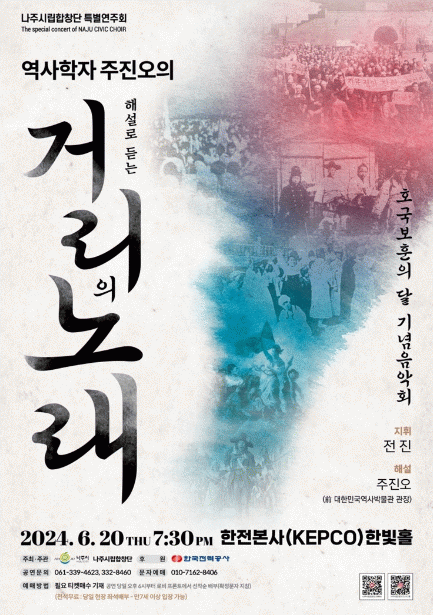 나주시는 오는 20일 오후 7시 30분부터 한국전력 본사 한빛홀에서 ‘역사학자 주진오 해설로 듣는 거리의 노래’라는 주제로 시립합창단 공연을 한다고 14일 밝혔다.
