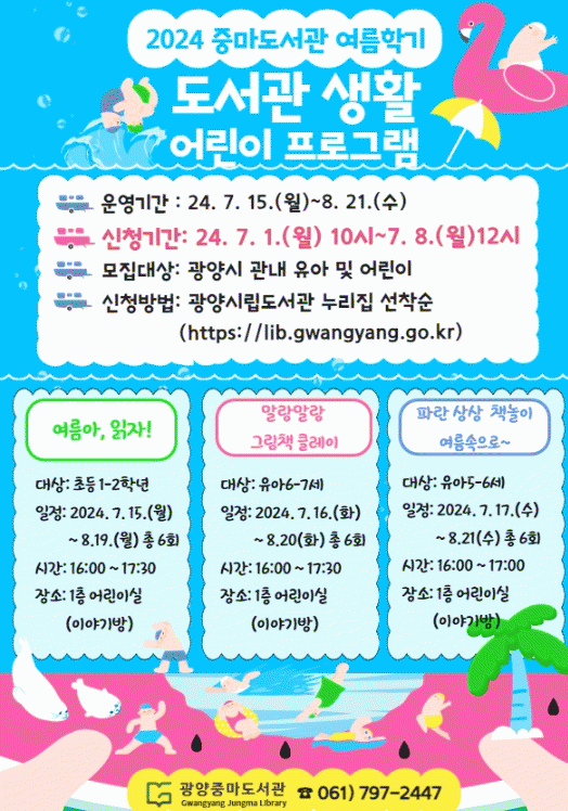 ‘2024 중마도서관 여름학기 도서관 생활 어린이 프로그램’ 수강 신청과 관련한 사항은 광양시립도서관 누리집 또는 중마도서관으로 문의하면 자세히 알 수 있다.