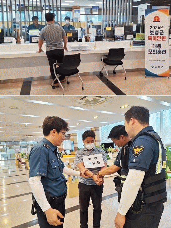이번 훈련은 폭언․폭행 등 민원실 내 특이민원에 대비하고 비상 상황 발생 시 대응능력을 향상하고자 민원 담당 공무원들의 역할을 사전에 부여해 보성경찰서와 합동으로 진행했다.