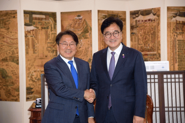 강기정 광주시장은 14일 오전 국회를 찾아 우원식 국회의장을 예방했다. 강 시장은 특히 우 의장에게 ‘5·18정신 헌법전문 수록 국회 개헌특별위원회 구성 건의서’를 전달했다. 건의서는 강 시장을 비롯해 정무창 광주시의회 의장, 이정선 광주시교육감, 원순석 (재)5·18기념재단 이사장의 공동 명의다.