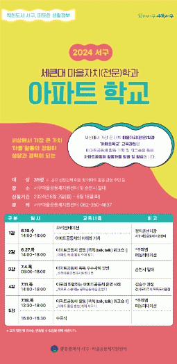 이번 교육은 서구 아파트공동체 회원 및 주민을 대상으로 창작농성골커뮤니티센터 1층에서 ▲아파트공동체 이해와 가치 확립을 위한 강의 ▲이웃과 화합하는 아파트공동체 운영사례 ▲아파트공동체 우수사례 탐방(순천시 일대) ▲아파트공동체 활동 기획을 위한 똑똑[talk,talk] 워크숍 등 총 5강의로 진행된다.