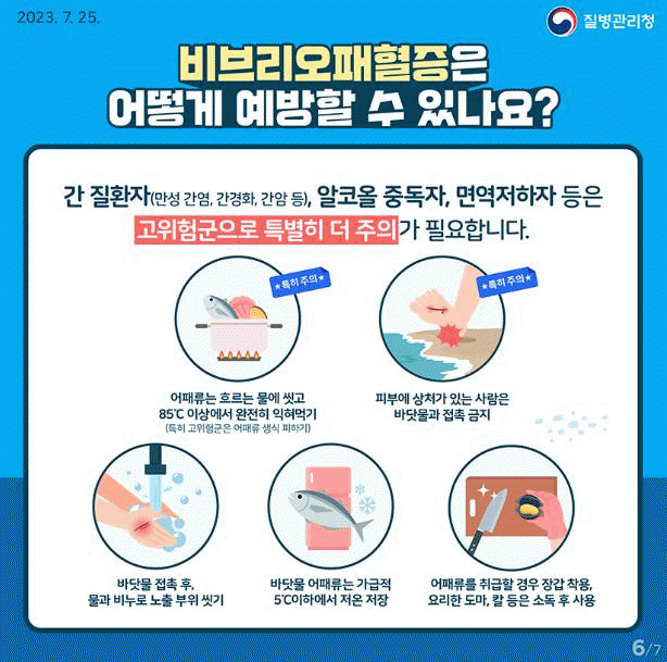 비브리오패혈증을 예방하기 위해서는 ▲어패류는 충분히 익혀 먹기 ▲피부에 상처가 있는 사람은 바닷물에 접촉하지 않기 ▲어패류는 5도 이하로 저온 보관, 85도 이상 가열 처리 ▲어패류 조리 시 해수가 아닌 흐르는 수돗물에 깨끗이 씻기 ▲어패류를 요리한 도마, 칼 등은 반드시 소독 후 사용 ▲어패류를 다룰 때 장갑 착용하기 등의 수칙을 준수해야 한다.