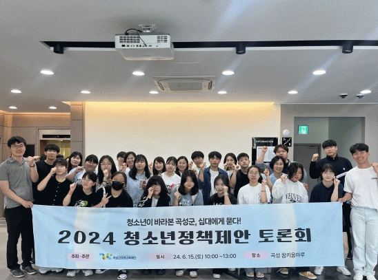 토론회는 곡성군 청소년정책제안 실현 사례 소개를 시작으로, 관내 중·고등학생, 학교별 학생회 임원, 곡성군청소년참여위원회, 청소년운영위원회, 학교 밖 청소년 등 다양한 청소년 집단이 참여했다. 이들은 청소년 공간 활용 방안, 지역 현안 및 사회적 이슈에 대한 정책 제안 토론, 해결 방안 모색, 제안 우선순위 선정 등의 순서로 진행됐다.