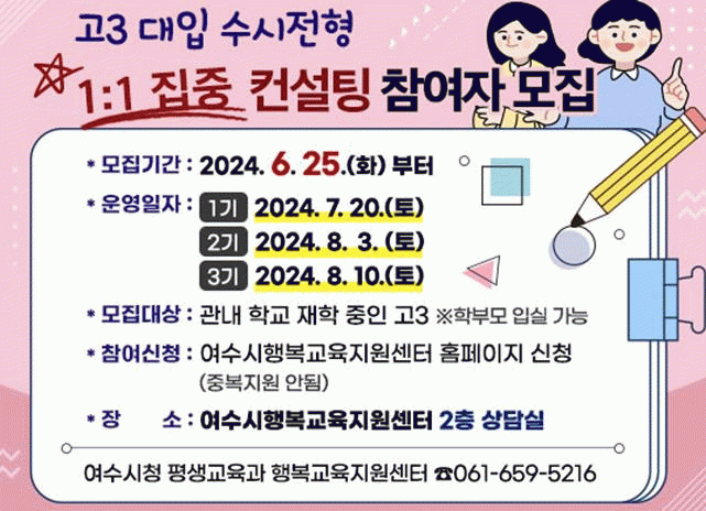 모집인원은 총 200여명이며 오는 ▲7월 20일 ▲8월 3일 ▲8월 10일 총 3회에 걸쳐 여수시행복교육지원센터 진학 상담실에서 진행한다.
