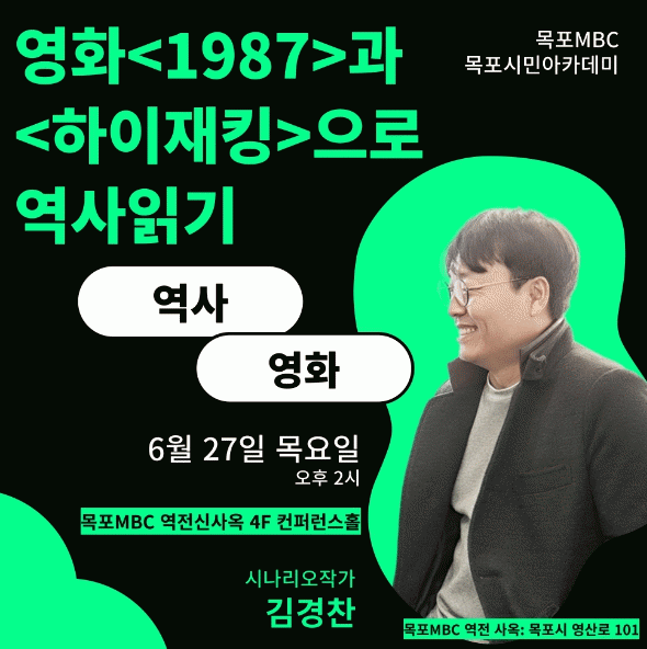 이번 아카데미 강좌는 시나리오 작가인 김경찬 작가를 초빙해 “영화 '1987'과 '하이재킹'으로 역사읽기”라는 주제로 진행된다.