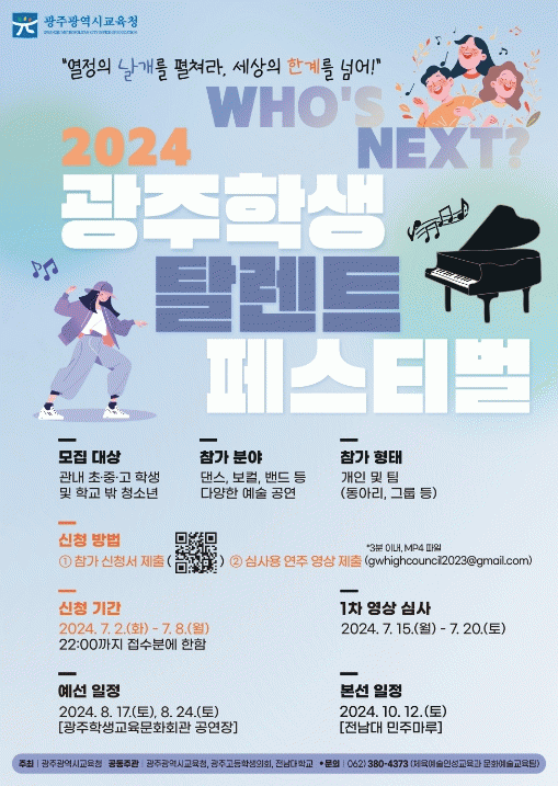 올해 ‘光탈페’는 더 큰 규모와 지원으로 확대 운영된다. 학생들의 신청 수요를 반영한 K-Pop 댄스, 밴드, 보컬, 연주, 국악 등 다양한 분야의 예술 공연 기회를 마련한다. 이와 더불어 예선을 거쳐 본선 경연을 통해 선정된 우수팀은 별도의 심사 과정을 거쳐 ‘학생 글로벌 리더 세계 한 바퀴 프로그램(光탈페)’에 참가 기회를 제공한다. 시교육청은 ‘光탈페’가 광주의 학생들이 예술적 재능을 자유롭게 표현함은 물론 K-Culture를 대표하는 예술 인재를 발굴하고 지원할 수 있는 장이 될 수 있을 것으로 기대한다.