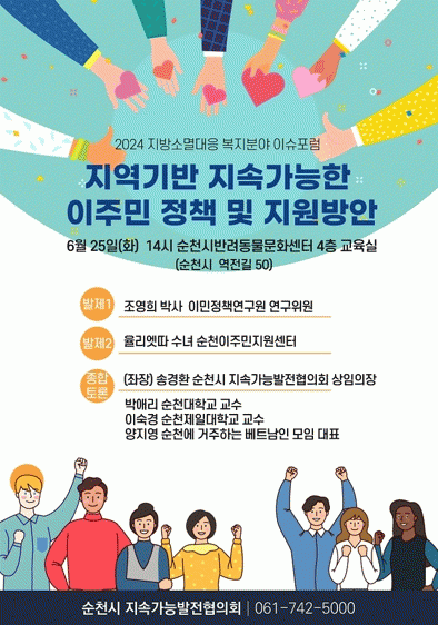 발제에는 조영희 이민정책연구원 연구위원의 ‘지속가능발전 관점에서 본 지자체 이민정책 활용방안’과 순천이주민지원센터 마리 율리엣따 수녀가 ‘우리 지역 이주민 이웃들’에 대해 발표한다.