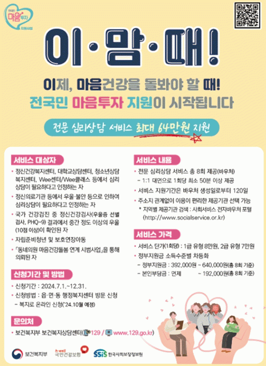 ‘전국민 마음투자 지원’은 국민의 마음 건강 돌봄은 물론 자살 예방 및 정신질환 조기 발견을 위해 우울, 불안 등 정서적 어려움이 있는 국민에게 심리상담 서비스를 지원하는 사업이다.
