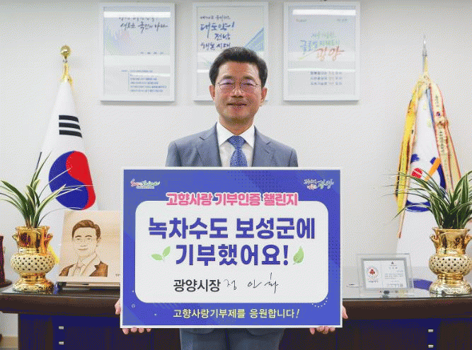 또한 정 시장은 녹차수도 전남 보성군의 고향사랑기부제 활성화를 응원하며 기부금을 기탁 한 후 김철우 보성군수를 다음 챌린지 주자로 지명했다.
