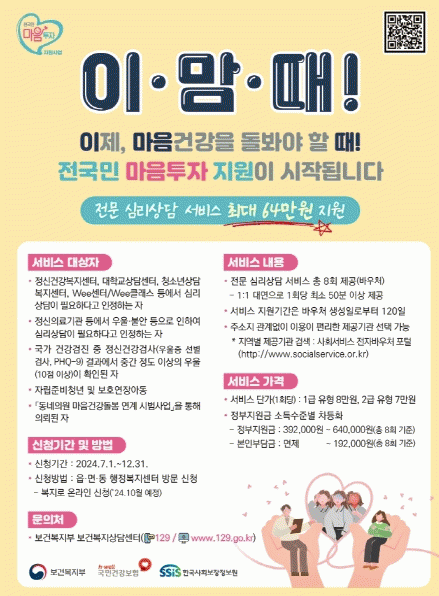 이 사업은 우울·불안 등 정서적 어려움이 있는 국민에게 전문적인 심리상담 서비스를 제공하는 사업으로 희망자에게 최소 50분 이상 1:1 대면 심리상담 서비스를 총 8회 받을 수 있는 바우처를 제공한다.