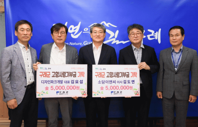 김순호 군수는 “지역 사랑의 마음을 전달해 주신 두 분께 감사드린다”며“기부금은 구례군민과 지역 발전을 위해 소중하게 사용하겠다”고 말했다.