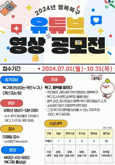 북구에 관심 있는 국민이면 누구나 참여할 수 있는 이번 공모는 개인 또는 4인 이하 팀 자격으로 응모할 수 있고 모집 영상은 ▲고향사랑기부제 ▲도시브랜드·캐릭터 ▲평두메습지 ▲소상공인·청년정책 등 북구의 매력과 행복을 나타낼 수 있는 주제의 영상이다.