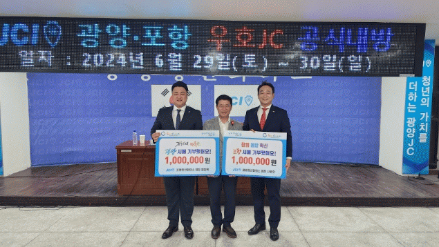 이번 기부는 광양JC와 포항JC의 교류 42주년을 기념해 양 단체의 회장들이 지역발전을 응원하며 서로의 지역에 100만 원씩 고향사랑 기부금을 쾌척한 것이다.