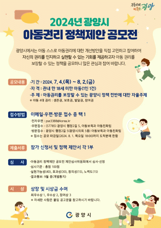 이번 공모 주제는 아동권리(▲생존권 ▲보호권 ▲발달권 ▲참여권)를 보장할 수 있는 광양시 정책 전반에 대한 자율주제로 진행되고, 광양시 거주 18세 미만 아동이면 누구나 참여 가능하다.