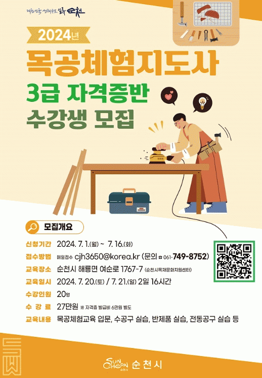 교육장소는 순천시목재문화지원센터(해룡면 여순로 1767-7)이다.