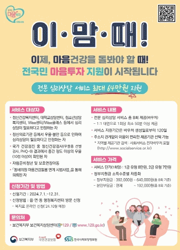 이 사업은 정부가 발표한 ‘정신건강정책 혁신방안’에 따라 마음건강 돌봄과 극단적 선택 예방, 정신질환 조기 발견을 목적으로 한다