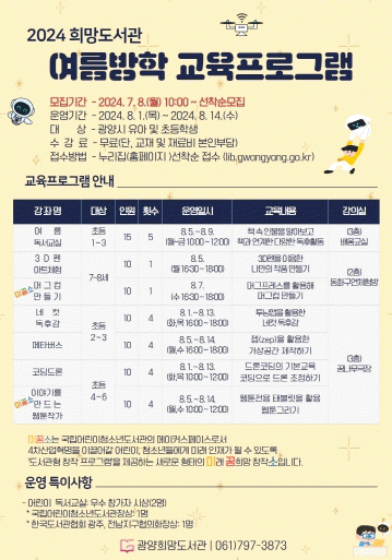 김현숙 광양시 희망도서관팀장은 “이번 미래교육 프로그램은 어린이들의 디지털 역량 강화와 창의력 향상을 위해 마련됐다”며 “아이들이 책과 친해지고 다양한 미래기술을 체험하면서 방학을 더욱 알차게 보낼 수 있기를 바란다”고 말했다.