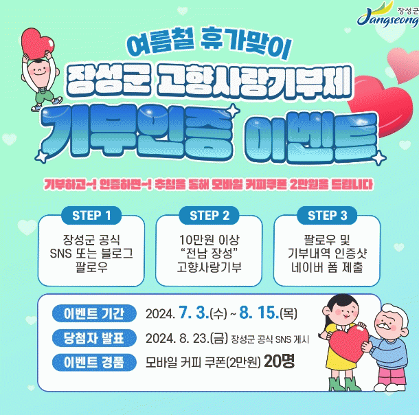 참여 방법은 장성군 공식 에스엔에스(SNS)나 블로그를 구독하고, 장성군 고향사랑기부제에 10만 원 이상 기부한 다음 구독, 기부내역 인증 사진(캡처 이미지)을 네이버폼에 제출하면 된다.