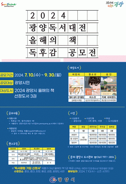 공모전은 광양시민을 대상으로 초등부, 중·고등부, 성인부 3개 부문으로 나눠 진행되며 연령별로 해당하는 부문의 도서를 읽고 독후감을 제출하면 된다.