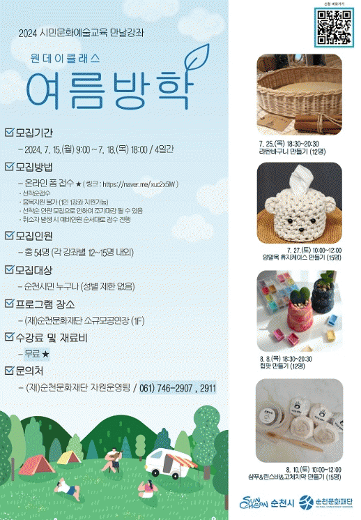 만날강좌 원데이클래스 '여름방학'은 온라인 네이버폼 접수로 수강생을 모집할 예정이며 자세한 내용은 (재)순천문화재단 누리집에서 확인 가능하다.
