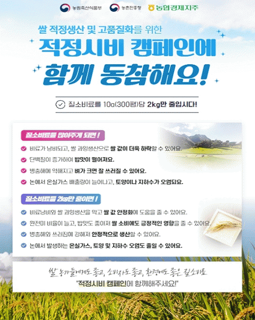 시 관계자는 “고품질 쌀 생산을 위해 질소질 비료를 2kg만 줄여도 쌀 과잉생산을 막아 쌀값 안정화에 도움이 되며, 밥맛도 좋아져 쌀 소비에 긍정적인 영향을 줄 수 있다”고 말했다. 또한, “7월 잦은 비 소식이 예정되어 있어 병해충 발생이 우려되므로 관내 벼 재배 농가들이 질소질 비료 적정・적량 시비에 적극적으로 참여해달라