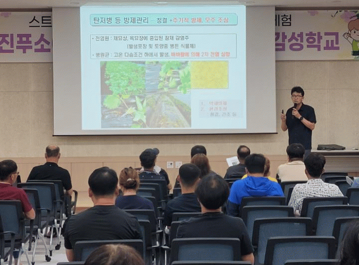 최영준 원예연구팀장은 강의에서 어미묘를 중심으로 장마기 약제 방제를 철저히 하는 것은 물론 하엽제거와 바닥정비를 통해 곰팡이 병 발생억제에 적절한 환경관리를 해줄 것을 당부했다.