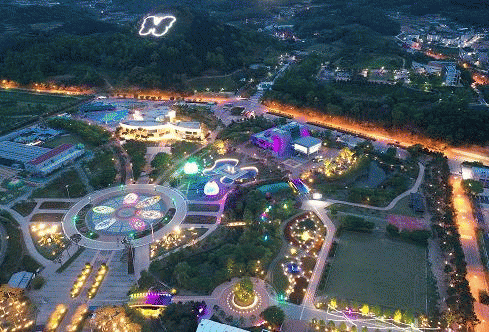 어스름이 내려앉은 저녁, 엑스포공원 일원에는 알록달록한 야간경관 조명이 켜져 늦은 시간에도 함평천지길을 걸을 수 있다.