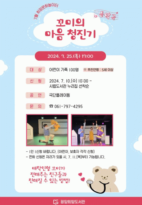 김미라 도서관과장은 “음악과 함께 온 가족이 함께 즐길 수 있는 희망문화놀이터 공연을 진행하니 도서관을 찾아 음악극을 감상하며 아이들의 자신감도 키우고, 무더위도 날리시길 바란다”고 많은 관심과 참여 당부했다.