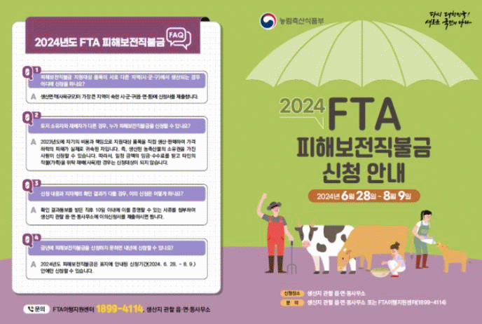 피해보전직불금 지급을 희망하는 농가에서는 오는 8월 9일까지 관련 증빙자료(FTA 협정 이전 품목생산, 2023년 생산·판매실적 등)를 갖추어 지급신청서를 생산지 관할 읍·면사무소에 방문해 제출해야 한다.