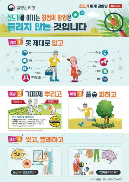 이 밖에도 진드기 매개 감염병은 쯔쯔가무시증, 라임병 등이 있으며, 예방수칙으로는 작업 전, 긴 옷에 토시를 착용하고 장화 신기, 작업 중, 풀밭에 앉거나 눕지 않고 휴식 시 돗자리를 사용하기, 작업 후, 작업이 끝나면 바로 목욕하고 작업복은 깨끗하게 세탁하기 등이 있다.
