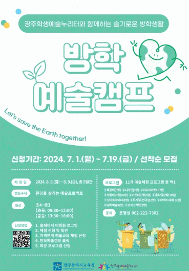 방학예술캠프 참여 희망자는 19일까지 광주학생예술누리터 누리집 또는 포스터 QR코드를 통해 신청하면 된다.
